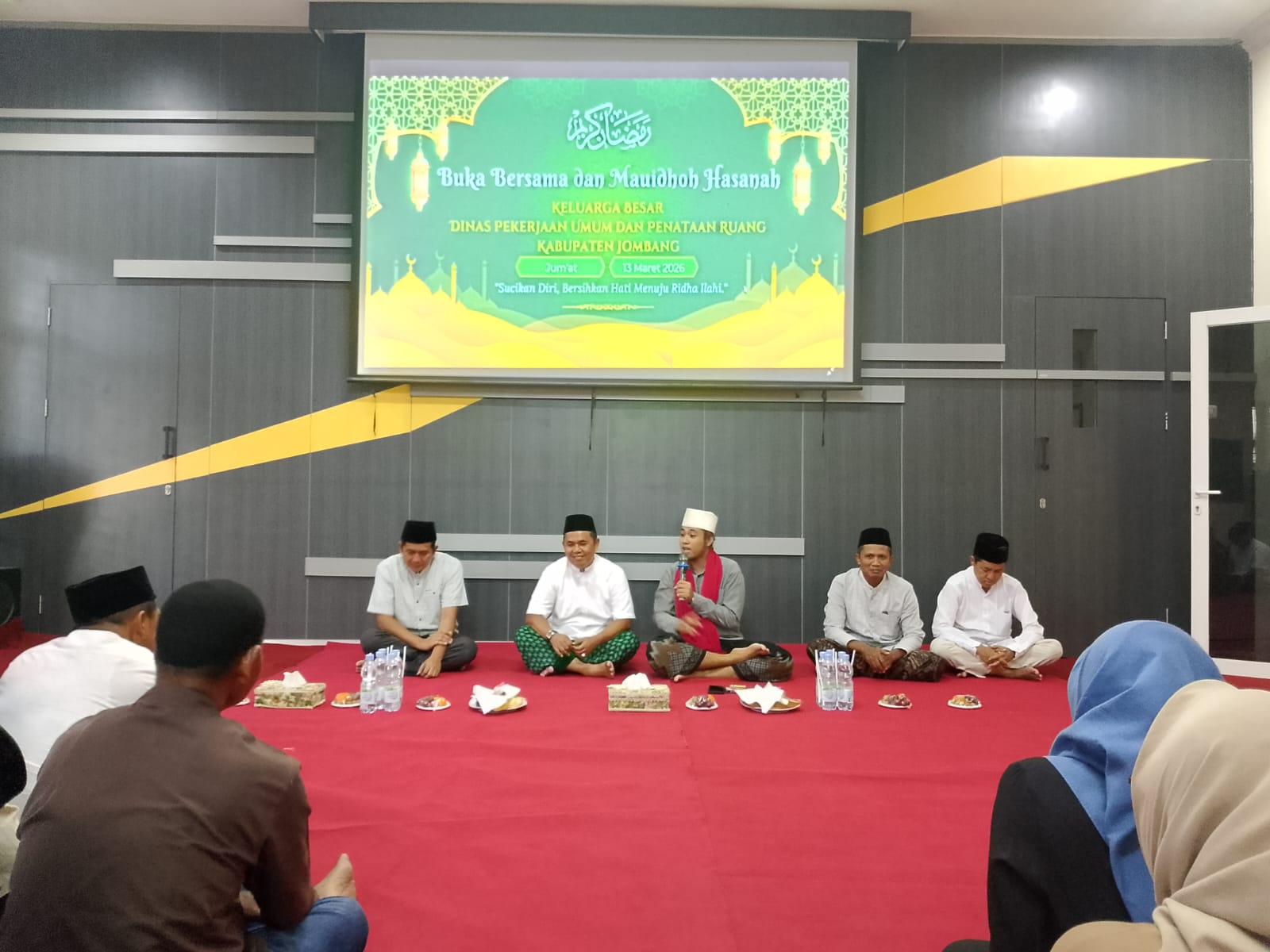 Jombang, Jum’at 13 Maret 2026 — Dinas Pekerjaan Umum dan Penataan Ruang (PUPR) Kabupaten Jombang menggelar kegiatan Buka Bersama dan Mauidhoh Hasanah yang berlangsung dalam suasana penuh kebersamaan dan kekhidmatan. Kegiatan ini dihadiri oleh Plt. Kepala Dinas PUPR Kabupaten Jombang, para pejabat struktural, seluruh karyawan dan karyawati, petugas cleaning service, serta tim URC Jalan yang turut hadir meramaikan acara tersebut.