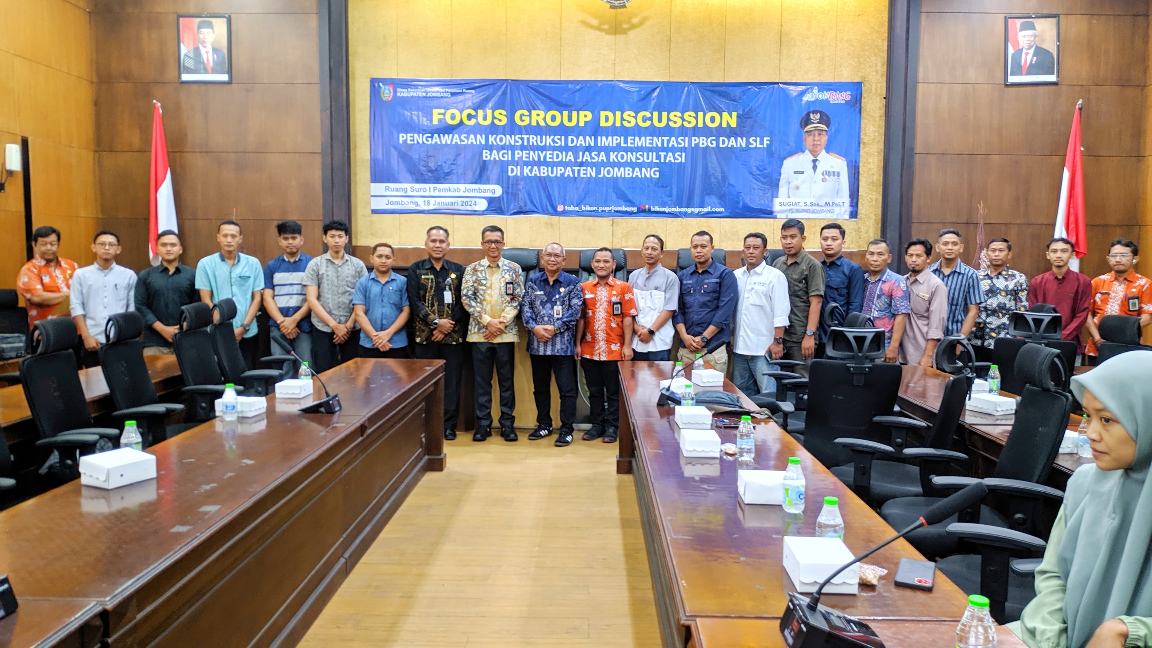 Rapat Pengawasan Konstruksi dan Implementasi PBG dan SLF Bagi Penyedia Jasa Konsultasi di Kabupaten Jombang yang diadakan dinas PUPR di ruang Soerodiningrat I Sekretariat Daerah Kabupaten Jombang Kamis, 18 Januari 2024. Yang dihadiri oleh Asisten Perekonomian dan Pembangunan Sekretariat Daerah Kabupaten Jombang, Kepala Bagian Administrasi Pembangunan Sekretariat daerah, Kepala Dinas PUPR beserta Kabid Tata Bangunan dan Bina Konstruksi, Ketua Asosiasi Ikatan Nasional Konsultan Indonesia (Inkindo), Ketua Asosiasi Persatuan Konsultan Indonesia (Perkindo) serta seluruh penyedia jasa konsultansi konstruksi.