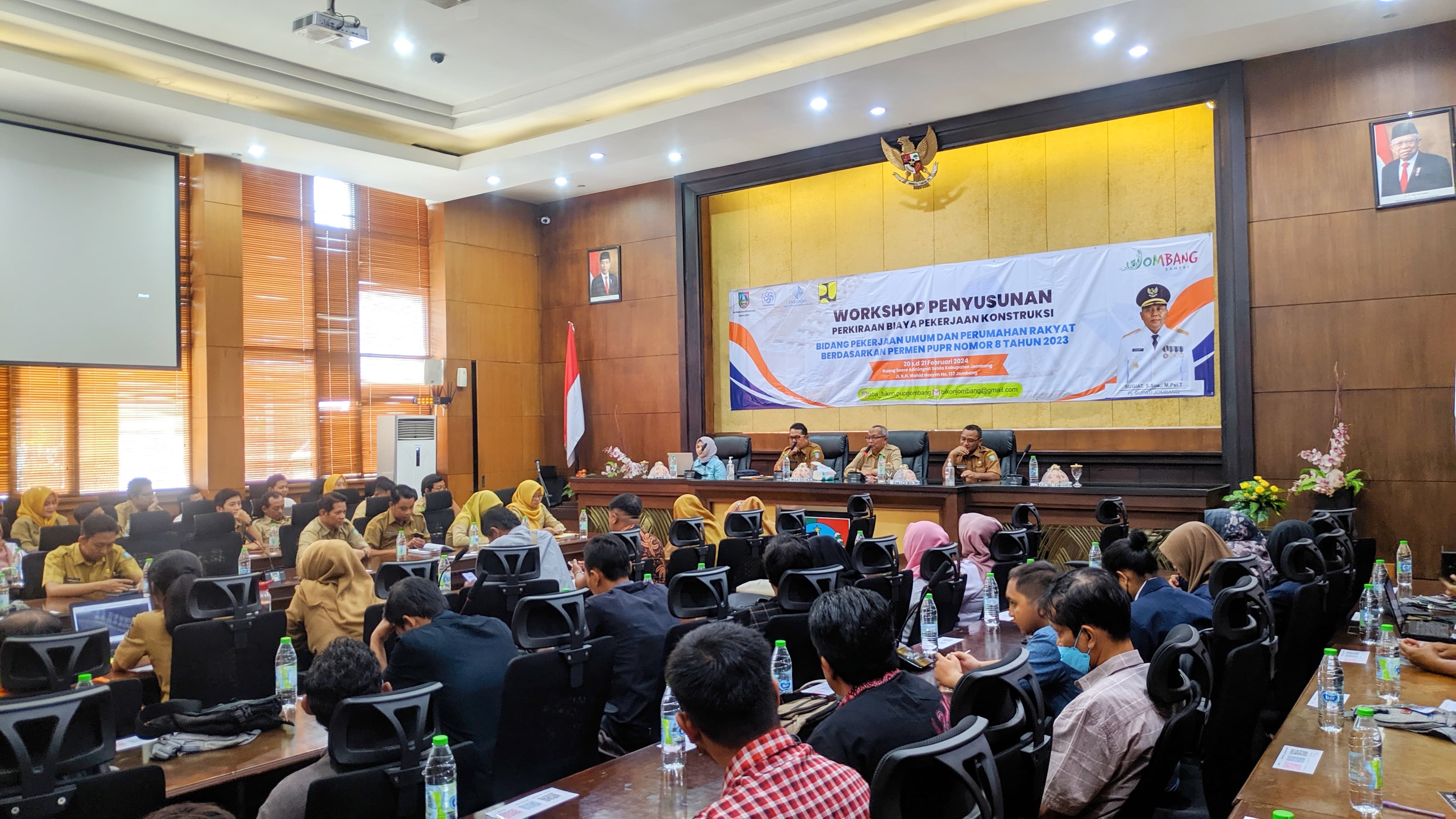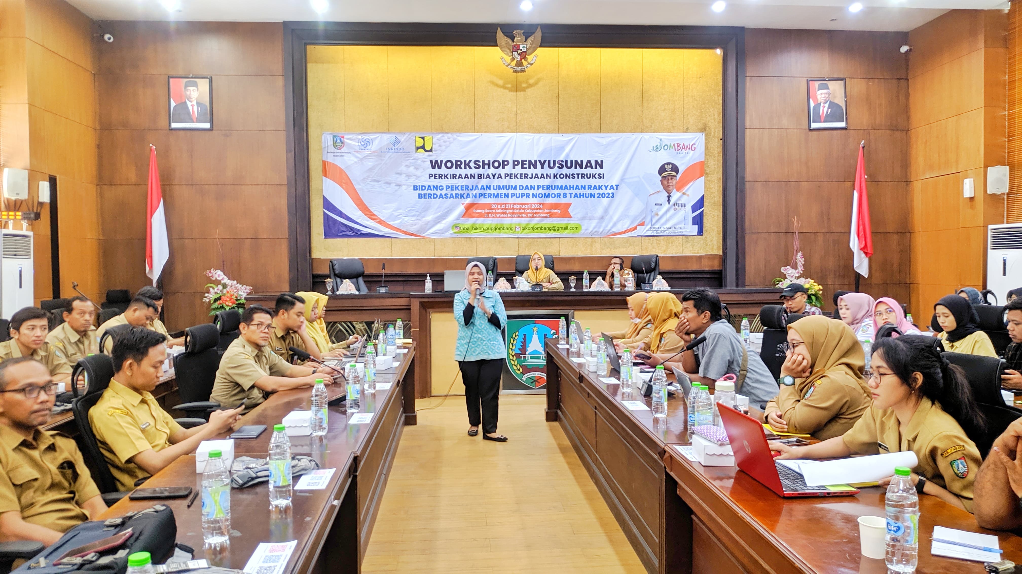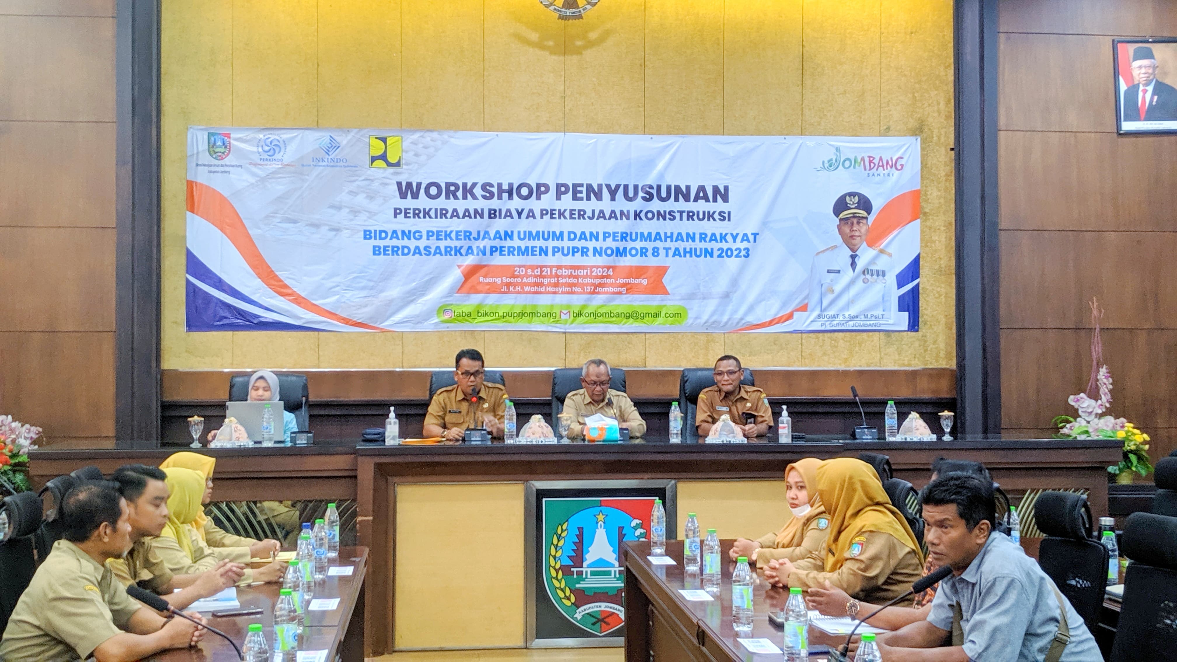 Workshop Penyusunan Perkiraan Biaya Pekerjaan Konstruksi Bidang Pekerjaan Umum dan Perumahan Rakyat Berdasarkan Permen PUPR Nomor 8 Tahun 2023 yang diadakan Dinas PUPR . Hari Selasa s/d Rabu Pukul 08.00 WIB di Ruang Soero Adiningrat Setda Kabupaten Jombang. Yang dihadiri oleh 11 Perangakat Daerah Terkait dan Penyedia Jasa Konsultansi Konstruksi yang ada di Kabupaten Jombang. dalam acara Workshop ini di buka oleh Drs. Wignyo Handoko, M.Si selaku Asisten Perekonomian dan Pembangunan Sekretariat Daerah Kabupaten Jombang.